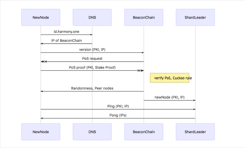 Since Harmony is a sharded blockchain, new nodes will be placed into an active node list at first after finishing a PoS verification via the beacon chain. The verification process starts when a new node create a transaction to deposit some coins to system accounts. The transaction is routed to the beacon chain after the new node establishes the first connection. Beacon chain nodes run consensus and verified the transaction to approve it. Once the transaction is approved, the new node can join in the network in a waiting list. The beacon chain will run VRF/VDF to generate unbiased randomness in order to do committee configuration. The re-sharding algorithm will place new nodes into different committee based on the randomness and the Bounded Cuckoo Rules. There is a higher probability for new nodes to join the committee with more nodes according to the Cuckoo Rules, thus to avoid the attack on committees with fewer number of nodes.